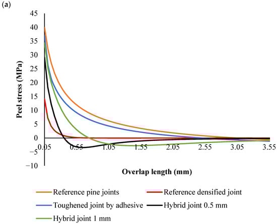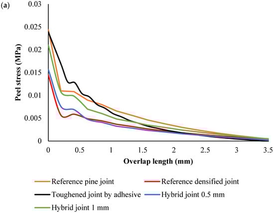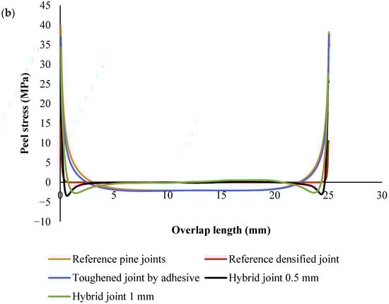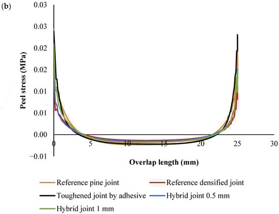 Across all configurations, the stress distribution followed similar trends (Figure 8); the peak peel stress was concentrated near the edges of the overlap, and the stress in the middle of the joint was generally lower. In the densified and hybrid configurations, the stress at the middle of the overlap was close to zero MPa, indicating that the majority of the load was concentrated at the overlap edges, where stress concentrations are highest. This is typical for joints with stiff substrates, as they resist deformation and transfer the load more efficiently to the edges. In contrast, in the reference and toughened pine wood configurations, the stress at the middle of the joint was negative, reflecting the more significant deformation and flexibility of the substrate. This flexibility caused compressive forces to build up in the center of the overlap.