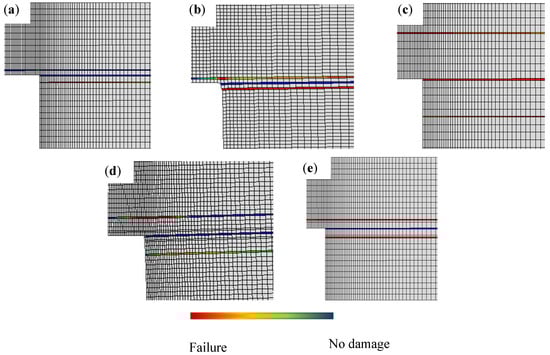 Damage parameter under intermediate loading. Reference joint (a), reference densified joint (b), toughened joint (c), hybrid joint 1 mm (d), and hybrid joint 0.5 mm (e).