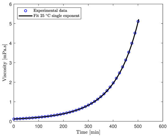 Plot of viscosity development with curing for the epoxy resin with fitted data for single exponent model presented in Equation (1).