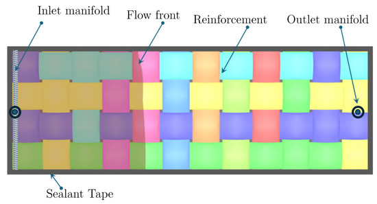 In this study, an analytical model is proposed by assuming a unidirectional flow through the mould in realistic conditions. The uni-directional flow assumption is justified here because the inlet gate was designed in a way that the flow of resin enters the mould parallel to the width of the mould, ensuring an in-plane flow, as shown in Figure 5. Flow through the thickness of the mats is neglected in this model, which is a valid assumption because the thickness of the mould is at least two orders of magnitude less than the planar dimensions of the layup of reinforcement mats. The conditions mentioned above are realistic and are valid for a wide range of practical cases in the infusion process. The constant inlet pressure boundary condition is also ensured during the process.