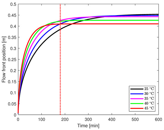 Plot of the flow front with time for UD flow case. The dotted red line exemplifies a three-hour mould filling time-frame. Infusion at 40 or 45 °C results in an early gelation point causing an incomplete mould filling, while 25 °C causes inefficient filling and extended duration. An optimal starting temperature of 35 °C ensures efficient mould filling.