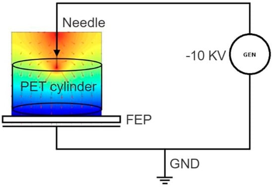 When designing an energy harvester for capturing energy from human motion, a fundamental aspect is to ensure the non-invasiveness to the natural walking movement [18]. For this reason, we created electrets of adequate size, thin, and flexible so that they can easily bent inside a shoe sole along the walking motion. We used the 50 µm FEP foils to fabricate electrets by the corona charging method [19]. The schematic of the experimental setup is reported in Figure 1. It consists of a high-voltage generator connected to a stainless-steel needle, with a holder to maintain the desired distance between the needle under HV and the FEP film surface to be charged. A ground copper electrode is added below the FEP to close the circuit. Additionally, a cylinder made of PET material was placed between the FEP surface and the tip of the needle.