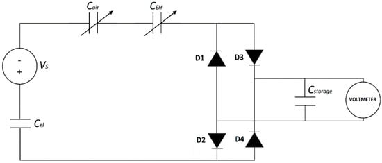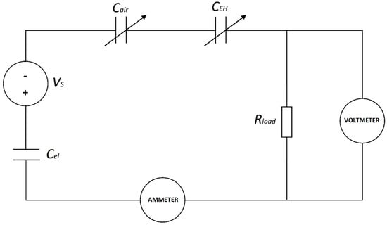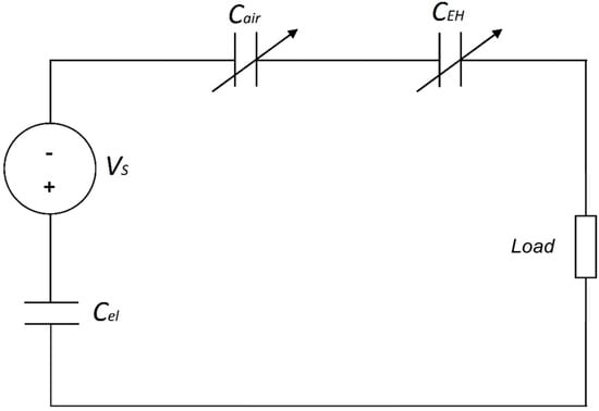 where Cel is the electret capacitance (given by ), while Cair, and CEH are that of the air gap and the EH elastomer, respectively. The following equations describe the operation of the system [20] in the case the load is resistive (Rload [Ω]). Based on Kirchhoff’s law and the differential equations governing the electrostatic system, the current intensity flowing through the load resistor can be expressed as