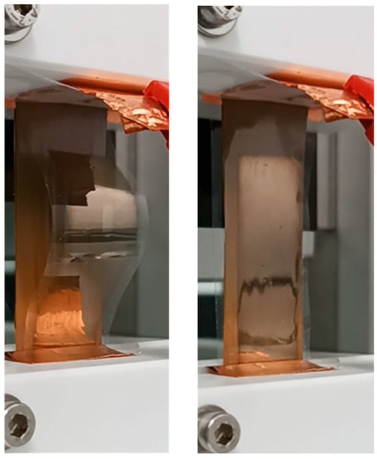 To obtain the electrical charges’ rearrangement, the electret needs to be employed in a particular configuration for the energy harvesting operation cycle (about 1 Hz period), coupled to the dielectric elastomer. We chose as DE a home-made strip fabricated with a nanocomposite polyurethane (TPU-CaCu3Ti4O12 50:50 v/v), as previously reported by our group [3]. In resting conditions, the electret and the DE are coupled so that the DE is fully stretched while the electret is curved away from it (e.g., see Figure 3). These coupled elements are connected to the load resistance Rload with two electrodes. The first principal electrode is on the back surface of the electret. The electret’s charged surface, on the other hand, directly faces the bare side of the DE strip, which has a Au electrode layer on its opposite side towards the load (Figure A1).