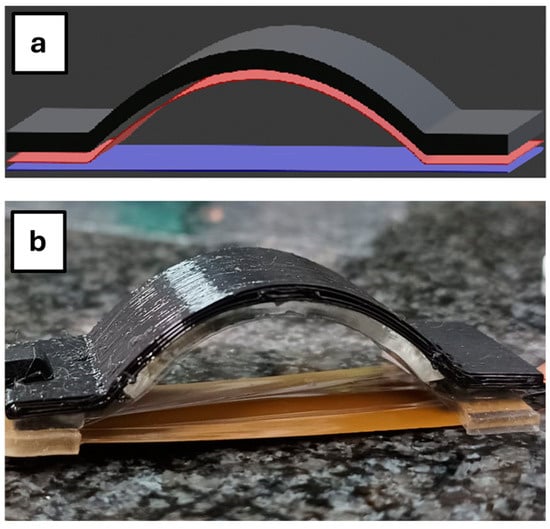 The TPU support (Figure A4) was fabricated with the desired size and shape (5 cm × 4 cm, 0.2 cm thick and 1 cm high in the central part) using the FDM 3D printer F170. In Figure 5a, the black part represents the TPU printed structure, the red layer represents the FEP electret, and the blue layer represents the DE strip. We underline that, if the plane electret is handled to be attached to the TPU support after corona charging, it should lose an important portion of its charge density. To avoid this drawback, the electret is processed by corona charging in the curved geometry directly, after being fixed to the TPU arc supported by a double-sided adhesive.