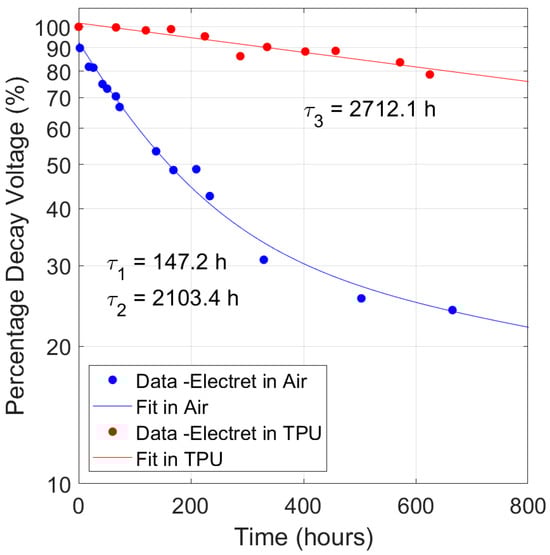 On the other hand, the electret stored in the TPU case (6.5 cm × 7.5 cm × 1.2 cm and the walls 0.2 cm thick) shows a slower decaying trend (red markers). A single exponential function () fit to the red dotted data gives a time constant value (τ3) of about 2700 h. The lifetime of the electrets is clearly higher when they operate surrounded by TPU rather than immersed in air. By comparing the time interval (about 20 h vs. 600 h) in the two sets of experimental data corresponding to the same percentage decay (80%) it is possible to estimate a factor of 20 difference in surface voltage lifetime.