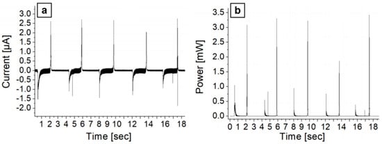 In the EH accumulation tests, performed following the procedures in Section 2.2, each energy conversion cycle (elongation-release) produces two opposite polarity peaks on the load resistor with respect to the bare leakage current level (Figure 8a). From this current signal, the power value on the load resistor was then calculated (Figure 8b). Finally, by numerically integrating the power peaks, the energy generated value over a given time interval is obtained; we typically consider the experimental energy value over some tens of cycles (sum over negative and positive peaks) and then derive the figure of merit of average energy generated per cycle and per unit area of EH material.