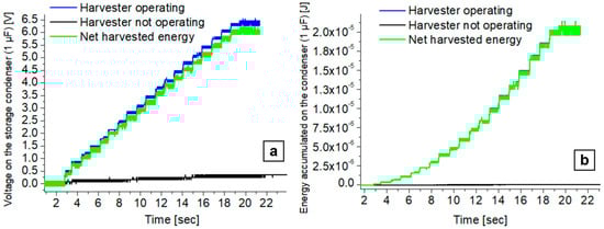 Experimentally, two different accumulation tests were carried out in the configuration described. The voltage on the storage capacitor was first monitored with the harvester at rest, to accumulate the system leakage current and electromagnetic rubbish only, and secondly with the harvester in periodic motion at 0.5 Hz frequency (see Table 3 for the experimental parameter values).
