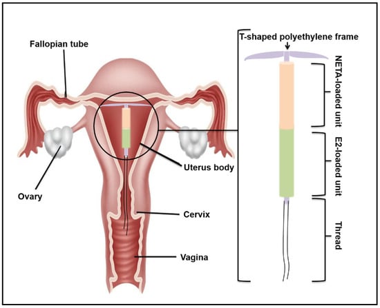 - Abdelgader, A.; Govender, M.; Kumar, P.; Choonara, Y.E. A Novel Intrauterine Device for the Spatio-Temporal Release of Norethindrone Acetate as a Counter-Estrogenic Intervention in the Genitourinary Syndrome of Menopause. Pharmaceutics 2024, 16, 587. [Google Scholar] [CrossRef] [PubMed]