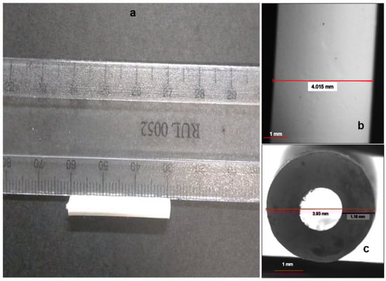 The formulation variables and processing methodologies adopted for the preparation of EPHCD were chosen based on preliminary investigations and an extensive review of relevant literature. Previous studies have highlighted PCL as an appropriate foundation for matrices intended for implantation into the female genitourinary system [1,29,30,31,32,33,34,35]. The range of polymer ratios investigated in this study, which was determined through preliminary evaluation, aimed to ease processing in terms of molding and demolding, achieving fracture-free device surfaces. Figure 2 depicts the successful fabrication of EPHCD, characterized by an average dimension of 30 mm length, 4 mm diameter, and a 1.5 mm inner diameter.
