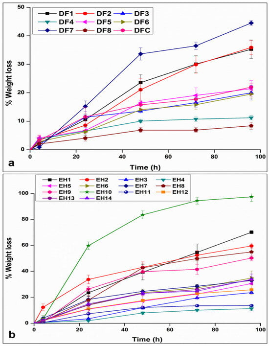 Weight loss % in high-pH media as a function of time of (a) the DF design devices and (b) the EPHCD design formulations. The data for DF1, DF2, DF3, DF4, and DFC were reproduced from Abdelgader et al. [21], © 2024 by the authors, Licensee MDPI, Basel, Switzerland.