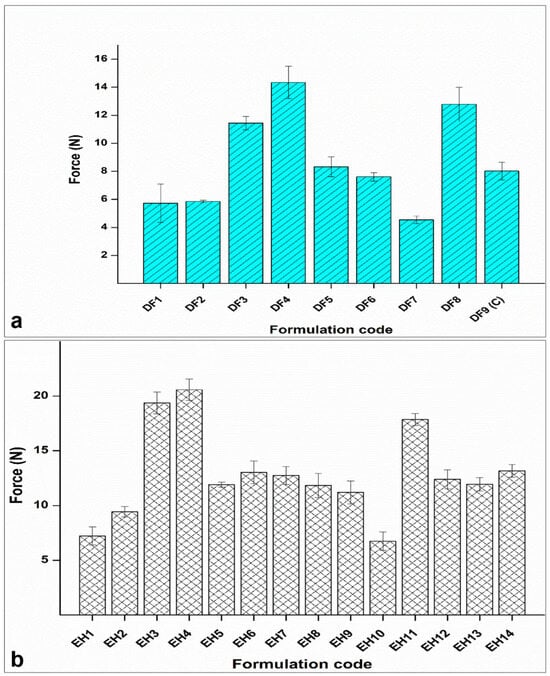Analysis of indentation force of (a) the DF design devices and (b) the EPHCD design formulations. The data for DF1, DF2, DF3, DF4, and DF9 (C) were reproduced from Abdelgader et al. [21], © 2024 by the authors, Licensee MDPI, Basel, Switzerland.