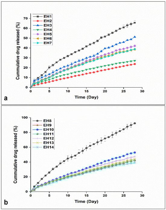 The release profiles of the EPHCD design formulations: (a) E1 to E7; (b) E8 to E14.