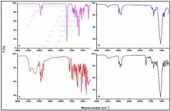 FTIR spectra of (a) PCL, (b) EC, (c) E2, and (d) the optimized EPHCD. The FTIR spectra of PCL and EC were reproduced from Abdelgader et al. [21], © 2024 by the authors, Licensee MDPI, Basel, Switzerland.