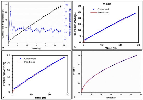 In addition to the aforementioned, it is worth noting that the EPHCD was designed with the aim of sustaining the drug payload over an extended period of time (4 to 5 months); however, herein, the drug release was studied over 4 weeks, with the data obtained during this period used to predict the absolute cumulative drug release (100%) for the optimized formulation through drug release kinetics modelling.