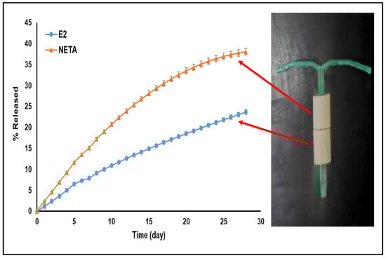 The drug release pattern of MCDDS in SUF over a four-week period was investigated as aforementioned. Drug quantification was performed using a high-performance liquid chromatography (HPLC) technique, adapted from a previously reported protocol [28], for simultaneous detection of E2 and NETA. Briefly, the HPLC system comprised a Flexar Binary LC pump and a Flexar UV/VIS LC detector (PerkinElmer Inc., Waltham, MA, USA) paired with a Brownlee Analytical C18 column (5 µm particle size, 4.6 mm diameter, 150 mm length; PerkinElmer, USA) operating at ambient temperature (22 °C). Chromatographic separation was attained via isocratic elution with a mobile phase comprising 60:40 acetonitrile to water, delivered at a flow rate of 0.8 mL per min, and each 20 µL injection was analyzed over a total run time of 12 min. The retention times for E2 and NETA were 3.26 and 8.66 min, respectively, with both drugs detected at 240 nm. Standard solutions of E2 and NETA were prepared by dissolving the drugs in SUF and diluting to appropriate concentrations. The peak areas exhibited a + linear relationship, with E2 and NETA concentrations ranging from 1.56 to 50 µg/mL. Data acquisition and analysis were performed using Chromera software (Version 4, PerkinElmer, USA). The cumulative drug release (n = 3) was determined based on HPLC data and normalized to the total drug content in the MCDDS.