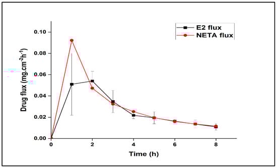 The transport of a drug molecule across a biological membrane is significantly influenced by several crucial parameters. These include the molecules’ size, charge, lipophilicity, and hydrogen-bonding capacity. Physicochemical and structural attributes, such as molecular size, charge distribution, lipophilicity, and hydrogen-bonding capacity, play pivotal roles in determining the diffusional behavior of molecules across biological membranes [47]. As the accumulation of E2 and NETA in genitourinary tissues is crucial for exerting pharmacological effects and controlling GSM in a safe manner, their adequate accumulation was assessed by determining the flux of E2 and NETA released from the EPHCD and NLPM, respectively, through the uterine membrane. The flux of both hormones across porcine uterine tissue over 8 h is depicted in Figure 10. The results indicate an initial escalation in the rate of E2 flux up to (0.054 ± 0.009 mg cm−2 h−1) during the first 2 h and NETA flux up to (0.092± 0.001 mg cm−2 h−1) during the first hour, followed by a subsequent decrease in drug flux. This indicates that the mechanism of drug transport through the porcine uterine membrane is hindered by binding and accumulation of E2 and NETA onto the membrane after 2 and 1 h, respectively. Therefore, it can be suggested that most of the drug was adsorbed onto the surface of the tissue, enabling localized effects in the uterus and potential washing out through uterine fluid to translocate and exert therapeutic effects in the vaginal tissue. However, the possibility of systemic absorption cannot be excluded. In the event of systemic absorption, this may expand the therapeutic applicability beyond GSM. Nonetheless, further studies are warranted to assess the extent of systemic exposure, as well as to elucidate any potential systemic therapeutic benefits and associated adverse effects.
