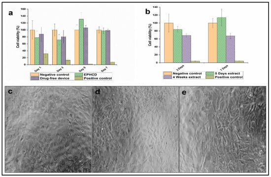 Cellular viability of NIH/3T3 by MTT assay in the presence of (a) the optimal EPHCD and DF formulations, (b) the mixture (1:1) of 5-days and 4-week extracts of the EPHCD and NLPM, in addition to micrographs of NIH/3T3 cells after 7-day treatment at 20× for (c) the negative control in cell culture media, (d) the DF device extract, and (e) EPHCD extract (scale: 1 cm = 100 µm). Data and image of negative and positive control were reproduced from Abdelgader et al. [21], © 2024 by the authors, Licensee MDPI, Basel, Switzerland.