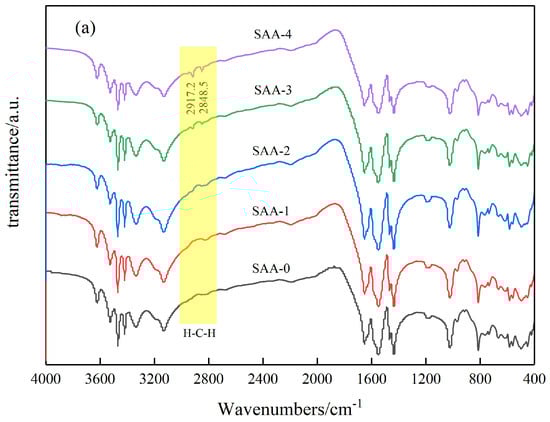 Figure 2a shows the infrared spectra of the inorganic flame-retardant powders after surface modification with different amounts of stearic acid. As can be seen, the peaks at 2917.2 cm−1 and 2848.5 cm−1, which represent the asymmetric and symmetric stretching vibrations of the methylene group (H-C-H), appear in the samples SAA-2, SAA-3, and SAA-4. These peaks are more pronounced in SAA-3 and SAA-4, less noticeable in SAA-2, and absent in SAA-1 and SAA-0. Figure 2b displays a magnified view of the methylene peaks for SAA-2, SAA-3, and SAA-4. This indicates that when the content of stearic acid exceeds 1%, a strong chemical bond is formed between the stearic acid and the flame-retardant powders, covering the surface of the powders [13]. Moreover, the intensity of the chemical bonds increases with the mass fraction of stearic acid.