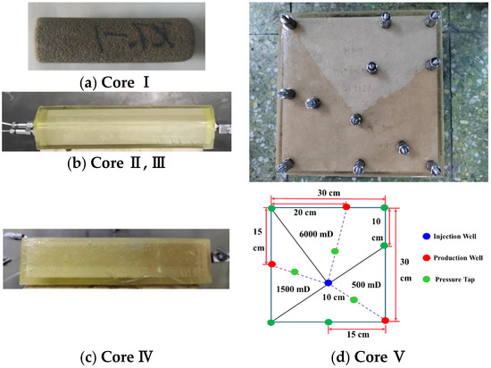 The average permeability distribution range of the B oilfield block was 500–6000 mD, and the permeability ratio distribution was within the range of 2–10, mainly concentrated around 3–4. Based on the characteristics of the B oilfield block, artificial cores were designed, including four types, with parameters listed in Table 1. Among them, Core IV was a plane heterogeneous model scaled down from a field model according to similarity criteria for laboratory conditions. Physical and design drawings of the cores are shown in Figure 2.