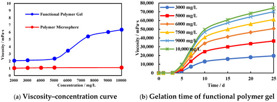 The viscosity–concentration curves of the functional polymer gel and polymer microsphere are shown in the Figure 3. As shown in Figure 3a, the initial viscosities of both the functional polymer gel and the polymer microsphere were very low. For the functional polymer gel, within the concentration range of 2000–10,000 mg/L, the initial viscosities were always below 10 mPa·s. Within the concentration range of 2000–5000 mg/L, the initial viscosity fluctuated within 0.3 mPa·s and stabilized around 2 mPa·s. When the concentration exceeded 5000 mg/L, the initial viscosity began to increase and gradually stabilized after reaching a concentration of 7500 mg/L, ultimately stabilizing around 6 mPa·s. For the polymer microsphere, within the concentration range of 2000–10,000 mg/L, the initial viscosity fluctuated by no more than 0.08 mPa·s and remained stable at around 1 mPa·s.