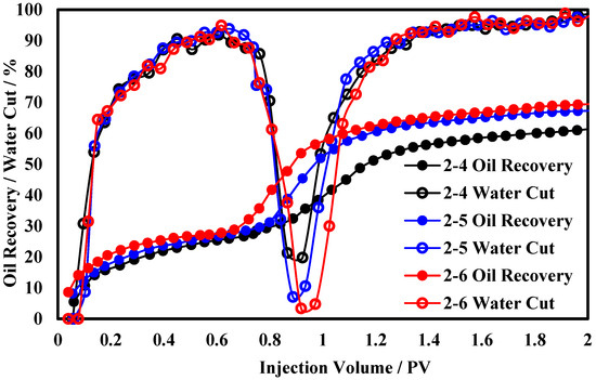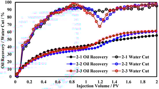 Table 6 presents experimental data on the impact of different chemical sizes on the oil recovery. Table 6 reveals that, as the chemical size increases, the rate of increase in the oil recovery gradually slows down. The analysis suggests that, due to the low initial viscosity and strong injectability of the two types of chemicals, they enter the core along the water-driving channels of the high-permeability layer during injection. When the injected size is too large, it can lead to direct production at the production end, resulting in the waste and ineffective injection of chemicals, which cannot further enhance the profile control effect and impact the oil recovery.