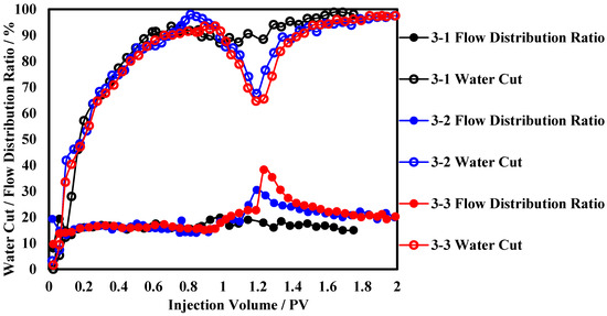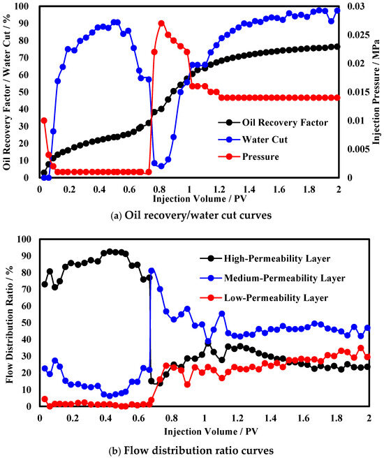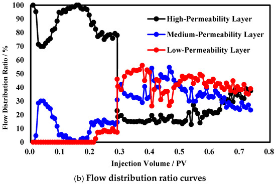 The flow distribution ratio curves during oil displacement in heterogeneous models are shown in Figure 8b. During the water flooding process, the flow distribution ratio of the high-permeability layer can reach 90%, the middle-permeability layer decreases from 30% to 7%, and the utilization rate of the low-permeability layer is low, with the flow distribution ratio of the low-permeability layer remaining below 3% throughout the water flooding process. After chemical profile control, the flow distribution ratio of the high-permeability layer fluctuates around 30%; the middle-permeability layer’s flow distribution dominates, subsequently stabilizing around 45%; and the low-permeability layer is also effectively developed, with the flow distribution ratio stabilizing around 25%. The analysis attributes this to the plugging of the high-permeability layer by the functional polymer gel, which increases the seepage resistance of the high-permeability layer. During the subsequent injection of the polymer microsphere, the seepage resistance of the middle-permeability layer gradually increases, leading to a gradual increase in the flow distribution ratio of the low-permeability layer.