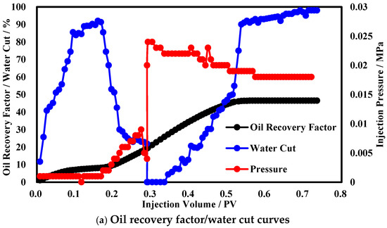 To simulate reservoir development performance, a planar heterogeneous core V was designed, and the production dynamic curves are shown in Figure 9a. During the water flooding stage, the water cut rose rapidly, reaching 90% around 0.17 PV, with a water flooding recovery factor of only 7.8%. During the functional polymer gel injection stage, due to the long injection time, the functional polymer gel properties gradually changed during injection, exerting a certain profile control function. The injection pressure rose, and the water cut rapidly dropped to 27%, before its profile control capacity reached its limit and the water cut stabilized. In the subsequent stage, pressure surged, and the water cut plummeted, with a 0.03 PV period of oil production without water. Afterward, pressure slowly declined, the water cut steadily rose, and the recovery factor continued to increase to 46%. After a cumulative injection of 0.5 PV, the water cut surged again, pressure flattened out, and the recovery factor stabilized at 46.5%.