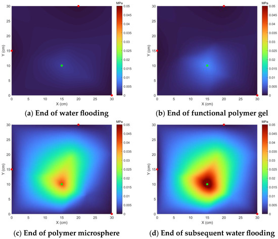 Pressure field diagrams at different stages are shown in Figure 10. Analysis reveals that in Figure 10a, after the water flooding ended, pressure distribution was relatively uniform throughout the core, but careful study found that the pressure gradient was smallest along the mainstream direction in the high-permeability area. Analysis suggests that sandstone has high permeability and low crude oil viscosity, resulting in low water flooding pressure, and water flows away along high-permeability channels, with small pressure fluctuations throughout the core. In Figure 10b, after functional polymer gel ended, pressure around the injection well rose, and pressure in the high-permeability channels rose significantly. Analysis suggests that the functional polymer gel had low initial viscosity and was injected along high-permeability channels, with a viscosity increase phenomenon during injection that exerted a certain profile control function. At this time, high blockage had not yet formed, so pressure changes in the entire area were small. In Figure 10c, after polymer microsphere ended, the pressure gradients of the mainstream directions in the three areas were high-permeability layer > medium-permeability layer > low-permeability layer. Analysis suggests that the profile control agent had blocked the high-permeability layer, and the polymer microsphere was gradually accumulating in the medium-permeability layer, while effectively exploiting the medium-permeability layer, resulting in a higher pressure gradient in the medium-permeability area. In Figure 10d, after the subsequent water stage ended, it was clear that the pressure gradient in the mainstream direction of the medium- and high-permeability areas was higher than that in the low-permeability area. Analysis suggests that the functional polymer gel and polymer microsphere were functioning, blocking the medium- and high-permeability layers, while effectively exploiting the low-permeability layer at this time. Analysis of the entire process suggests that this scheme achieved gradual exploitation of high-, medium-, and low-permeability layers, with effective exploitation.