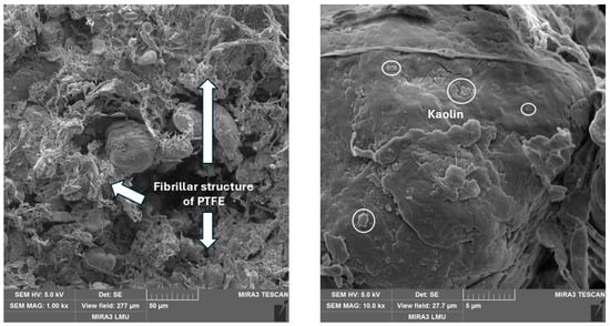 PTFE + kaolin. When filling the polymer matrix with kaolin, the effect of the oriented action of the filler is manifested; i.e., due to kaolin, macromolecules of non-polar PTFE are intercalated in the space between the plates of the filler with an increased value of the uncompensated charge. The kaolin surface appears partially embedded in the polymer space, indicating the interaction of the two elements at the interface (Figure 6). The fibrillar structure of PTFE was observed at a low kaolin content, which contributes to the effective lubrication of surfaces during friction, which was confirmed by a significant reduction in wear intensity. An increase in the concentration of the filler also leads to the aggregation of kaolin particles.