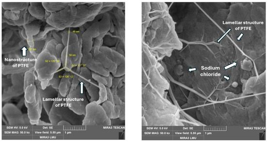PTFE + sodium chloride. An interesting structure of the composite was recorded with the addition of sodium chloride. Along with the usual elements typical for PTFE, the formation of nano-sized formations of the polymer matrix and lamellar strands with a thickness of 50 nm is observed, which form a regular three-rayed star (Figure 9, left). Particles of sodium chloride are randomly arranged within the material, contacting such polymer lamellae (Figure 9, right). At the same time, the formation of a polymer layer on the surface of the sodium chloride particle is not noticeable, as in the case of coke. This indicates an unstable contact of the filler with the matrix and an inactive surface of the filler. This thesis is confirmed by the results of mechanical and tribological tests.