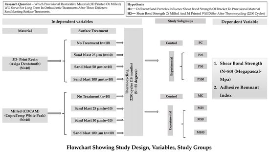 Few studies have investigated the shear bond strength between orthodontic brackets and milled provisional crowns [39,40]. Haber D et al. searched for the best mechanical, chemical, and/or combination surface treatments for CAD/CAM PCs. He concluded that orthophosphoric acid etching that is performed on natural crowns should not be done on milled PCs, besides concluding that mechanical surface treatments (diamond bur and sandblasting), along with chemical treatment (plastic conditioner), produced SBS equivalent to those with natural teeth [39]. Goracci C. et al., in their study on the effects of various surface treatments (medium and fine grit diamond bur and universal adhesive) on SBS between metal brackets and PMMA CADCAM PCs, found medium grit and universal adhesive to significantly increase SBS [40]. Sayed ME et al. reported that 3D-printed PCs were more colour stable than milled PCs when cemented with clear cement, thus making 3D-printed PCs a good aesthetic choice for long-term provisionals [16]. Any type of mechanical or aesthetic failure of PCs while undergoing orthodontic treatment has not only serious implications for the therapeutic effectiveness of the ongoing orthodontic treatment but has also been reported to have financial implications and replacement concerns [41]. Therefore, in the quest to search for an ideal long-term PC, this study was aimed at investigating the comparative differences between milled and 3D-printed PC materials after undergoing similar mechanical and chemical surface treatments and recommended ageing that qualifies for long-term PCs. The objective of the study was to identify the most appropriate provisional long-term restoration that should be chosen for restoring teeth while undergoing orthodontic treatment. The study hypothesises that there will be significant differences in the SBS between the two materials and that surface treatment and ageing will decrease the SBS. Alternately, the null hypothesis would state that there will be no differences between the materials and their respective surface treatments or ageing processes.