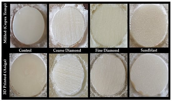Figure showing the disc-shaped specimens of two main groups: milled and printed and their respective subgroups based on mechanical surface treatment. (from left to right) Control—no treatment, coarse diamond—180 grit sandpaper, fine diamond—320 grit sandpaper, and sandblast (50 μm Al2O3).