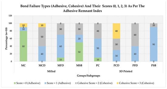 Comparative frequency distribution (in percent) of various bond failure types (adhesive and cohesive) and their scores (0 = no adhesive, 1 = ≤50%, 2 = ≥50%, and 3 = all adhesives) as per the adhesive remnant index, in specimens of various subgroups of milled And 3D-printed provisional crowns.