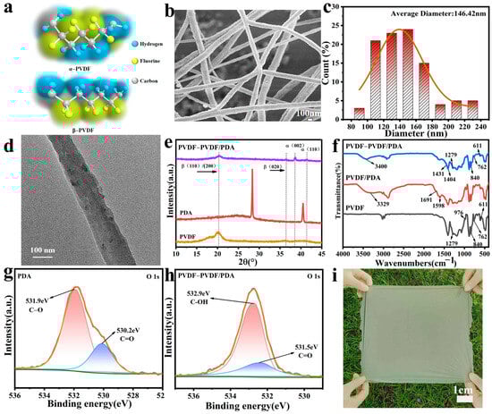 (a) Molecular structures of α-phase and β-phase PVDF. (b) SEM image and (c) nanofiber diameter distribution of S-3 NFMs. (d) TEM image of PVDF-PVDF/PDA NFMs. (e) XRD spectra and (f) FTIR spectra of PVDF, PVDF/PDA, and PVDF-PVDF/PDA NFMs. The O1s XPS spectra of (g) PDA and (h) PVDF-PVDF/PDA NFMs. (i) Photograph of PVDF-PVDF/PDA NFMs.