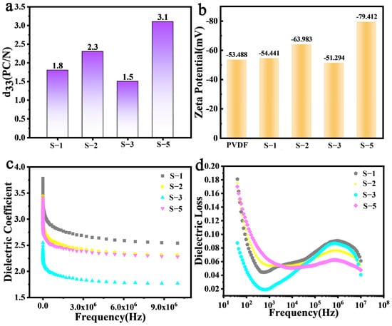 (a) d33, (b) Zeta potential on the solid surface, (c) dielectric coefficient, and (d) dielectric loss of S-1, S-2, S-3, and S-5 NFMs.