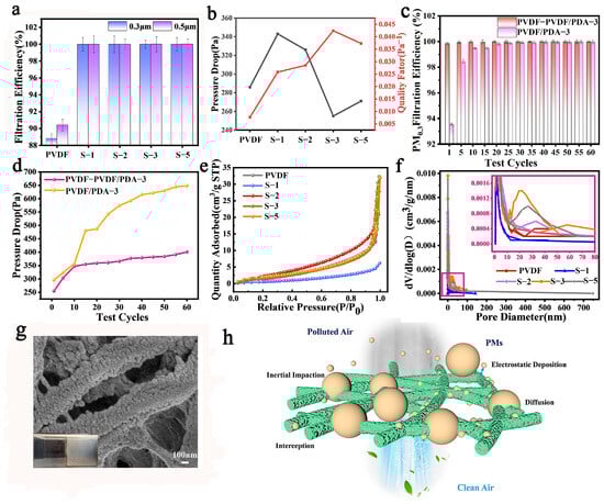 (a) Filtration efficiency, (b) pressure drop, and quality factor of PVDF, S-1, S-2, S-3, and S-5 NFMs. (c) Filtration efficiency and (d) pressure drop of S-3 and PVDF/PDA-3 under 60 cycles of filtration. (e) N2 adsorption–desorption isotherms and (f) pore diameter distributions of PVDF, S-1, S-2, S-3, and S-5. (g) SEM image of PVDF-PVDF/PDA after filtration (inset showing the filter simulation device). (h) Schematic of the filtration mechanism of PVDF-PDF/PDA NFMs.