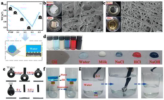 PVDF and PVDF-PVDF/PDA NFMs were put into 0.5 mol/L NaCl solution for two weeks, as shown in Figure 4b,c. When PVDF NFMs were in solution, the structure of the fiber was destroyed. However, PVDF-PVDF/PDA NFMs can maintain good fiber structure, and a large number of particles were adsorbed on the surface of the fiber. This may be because the specific surface area and other microstructures of the composite nanofiber membrane provide a basis for its adsorption in water. Moreover, modification of hydrophilic groups of PDA was conducive to the adsorption of membranes in water. Therefore, the composite nanofiber membrane can maintain good adsorption properties and fiber structure in a wet environment for a long time. This can provide ideas for its application in masks, protective clothing, and other fields. PVDF-PVDF/PDA nanofiber membrane was extremely lipophilic and hydrophobic to water, milk, saturated salt water (NaCl), acid solution (HCl, PH = 1), and alkaline solution (NaOH, PH = 13) (Figure 4d). PVDF-PVDF/PDA membrane was very good for oil infiltration and has a high contact angle for saturated salt water, acid solution, and alkaline solution. These characteristics make oil substances easier to spread on the surface of the nanofiber membrane. We studied the infiltration of the fibrous membrane by oil and water using a water contact angle tester. We used dichloromethane as the oily material. It can be seen that the water droplets completely leave the membrane surface after contact with the membrane, and the oil quickly diffuses on the membrane surface, indicating the good hydrophobic and lipophilic of the fibrous membrane (Figure 4e). PVDF-PVDF/PDA nanofiber membranes were composed of nanofibers with small fiber diameters and interconnected pores. This microstructure makes membranes have high porosity, can provide a larger specific surface area, and increases the contact area with the oil–water mixture, which is conducive to oil–water separation. Then, the ability of the PVDF-PVDF/PDA membrane to separate the oil–water mixture was investigated. It can be seen that transparent oil can easily penetrate the fibrous membrane, which is collected in the bottle below, and the blue aqueous solution remains above the container (Figure 4f). PVDF-PVDF/PDA membrane adsorbs methylene chloride (blue) in the water (Figure 4g), also indicating the hydrophobic oil affinity of the membrane. Due to the hydrophilicity of PDA carbon material and the hydrophobicity of PVDF, adhesion between water and the membrane surface is strong, while adhesion between oil droplets and the membrane surface is weak. In this case, oil droplets are more likely to be pushed by the water phase or taken away by water flow at the interface. Therefore, the synergistic action of surface charge and hydrophobicity of composite nanofiber membranes causes small oily droplets to aggregate and separate from trapped miscibility. This indicates that the composite nanofiber membrane has great potential in the field of oil–water separation.