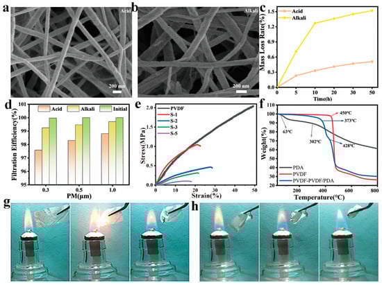 SEM images of PVDF-PVDF/PDA NFMs after a 5 h immersion in (a) HCl and (b) NaOH solution. (c,d) Mass loss after varying immersion time in HCl and NaOH solution and filtration efficiency after 5 h treatment. (e) Stress-strain curves of PVDF, S-1, S-2, S-3, and S-5. (f) TGA curves of PDA, PVDF, and PVDF-PVDF/PDA NFMs. Photographs showing (g) PVDF and (h) PVDF-PVDF/PDA NFMs under combustion.