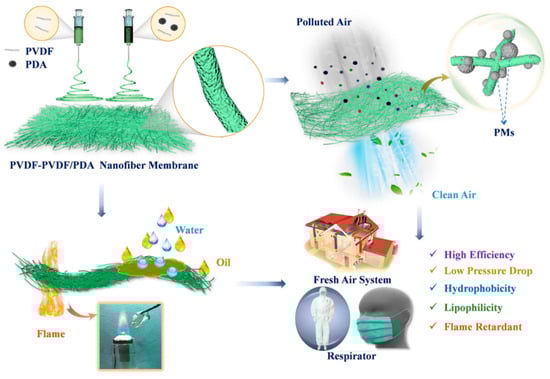 Fiber air filtration mechanisms include gravity effects, sieving, interception, inertial collision, Brownian motion, and electrostatic effects [9]. When PMs in the air pass through filters, electrostatic forces not only effectively attract charged particles but also capture PMs through electrostatic induction effects [10]. As a kind of self-polarizing electret material, PVDF is a highly nonlinear and structural organic polymer with certain piezoelectric properties. PVDF undergoes various mechanical, thermal, and electrical treatments, resulting in the formation of five polycrystalline structures: α, β, δ, ε, and γ, which can interconvert [11]. The β phase overall trans of phase molecular chain is combined with specific polarization in the crystal to produce the highest piezoelectric effect, accompanied by additional piezoelectricity [12]. More importantly, β-PVDF is formed under the stretching of the high-voltage electric field in the process of electrospinning. Polydopamine (PDA) contains a substantial number of catechol structures, endowing it with remarkable adhesion properties. Catechol structures can impart charges to nanoparticles. Owing to strong electrostatic repulsion force, nanoparticles encapsulated by PDA display extremely high stability. The strong adhesion enables PDA to adhere to the surface of inorganic and organic materials [13]. For example, Ma et al. [14,15] electrospun PVDF/PDA fiber membranes, presenting significant adsorption capacity for MB and Cu2+. Tian et al. [15] designed a two-stage electrostatically assisted air filtration device by a thin coating of PDA on the polyethylene terephthalate coarse filter. This filter achieved a high filtration efficiency of 99.48% for PM0.3. Therefore, PDA could be used to improve the adsorption capacity of membranes.