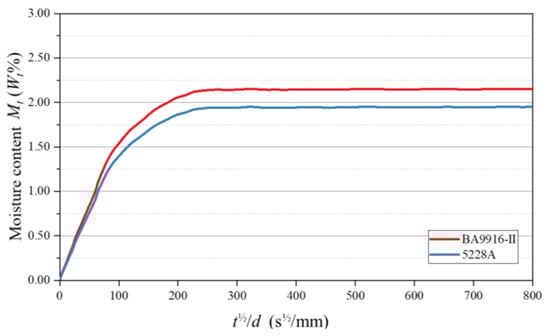 where and represent the moisture contents of the specimen at time and at equilibrium, respectively; is the diffusion coefficient; and is the specimen thickness. By plotting against , the moisture absorption curve of the specimen was obtained (as shown in Figure 1). From the horizontal extension line and the linear part of the curve, and could be determined, respectively, and the values are listed in Table 1.