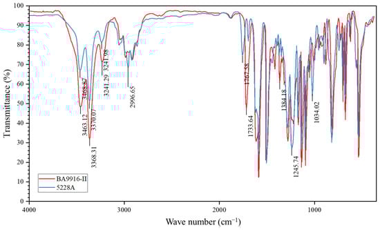 This difference results from their distinct molecular structures, as supported by the analysis of infrared spectra. Figure 2 shows the infrared spectra of AG-80 resin, which indicate that BA9916-II shows significantly lower transmittance (more than 20% lower) than 5228A at approximately 1717 cm−1, 3360 cm−1, and 3465 cm−1. The absorption peak at 1717 cm−1 is attributed to the stretching vibration of the carbonyl (C=O) group. This implies that BA9916-II likely has a higher content of carbonyl-containing functional groups such as ketones or conjugated carbonyls. Meanwhile, the absorption peaks at 3360 cm−1 and 3465 cm−1 are related to the stretching vibrations of N-H or O-H groups, suggesting that BA9916-II contains more alcohol hydroxyl, phenolic hydroxyl, amine, or amide structures.