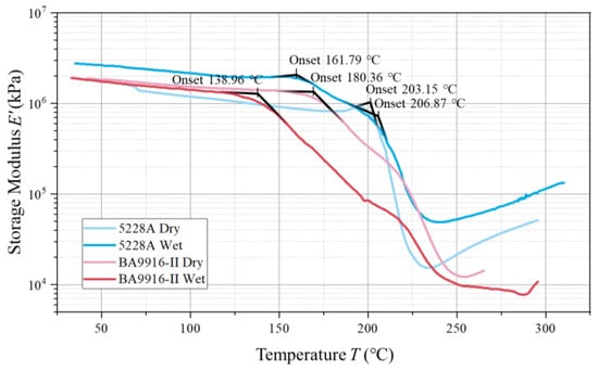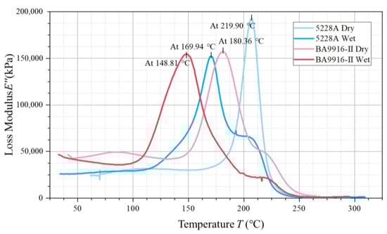 In the storage modulus curves (in Figure 4), the onset temperature of the slope change reflects the starting point when the material’s properties begin to change significantly. The onset temperature of the dry 5228A resin is 203.15 °C. The wet 5228A resin shows two slope changes at 161.79 °C and 206.87 °C, respectively. Both the dry and wet BA9916-II resins have an onset temperature of 180.36 °C. Notably, for the storage modulus, the dry-state 5228A resin has a value around 106 kPa, with a significant increase in the wet state. In contrast, for BA9916-II resin, the change in storage modulus between the dry and wet states is not obvious, only showing a change in the onset temperature.