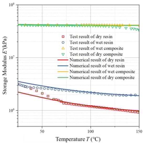 The comparison results between the model predictions and the measured values are shown in Figure 8. As can be seen from this figure, for the 5228A resin, the storage modulus decreases with the increase in temperature. The model prediction results are consistent with the experimental results. The viscoelastic model derived from the generalized Maxwell model can well reflect the properties of the material as an elastic solid and a viscous fluid.