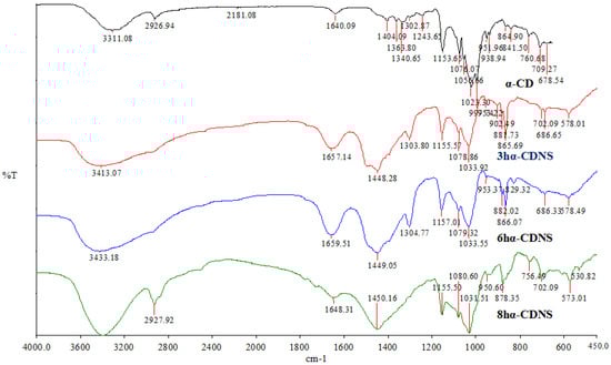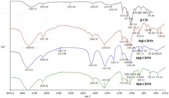 The FTIR spectra of α- CDs (Figure 1) and β-CDs (Figure 2) exhibited characteristic peaks at 3311 cm−1 and 3302 cm−1 (the O-H stretching vibration), 2925 and 2927 cm−1 (the C-H stretching vibration), ~1414 and 1334 cm−1 (the C-H deformation vibration), ~1154 cm−1 (the C-C stretching vibration), and ~1022 cm−1 (the C-O-C stretching vibration). In addition, a peak at 1640 cm−1, corresponding to the deformation bands of H-O-H, indicates the presence of water in the CDs [36,37]. In the FTIR spectra of α-CDNSs (Figure 1) and β-CDNSs (Figure 2) prepared at different solubilization times, the O-H stretching vibration at approximately 3400 cm−1, the C-H stretching vibration at 2927–2930 cm−1, and the bending vibrations at 1437–1453 cm−1, as well as the C-O-C stretching vibration at 1031–1033 cm−1 due to the normal alkane structure, were observed. The similarities between the spectra of the original CDs and CDNSs indicate that the basic structural units are preserved in CDNSs. However, some bands are shifted or broadened, confirming that a cross-linking reaction occurs between CDs and ECH components, resulting in the formation of new chemical bonds [11,13].