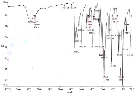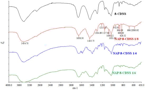 The FTIR spectra of NAP, NAP-loaded α-CDNS, and NAP-loaded β-CDNS are shown in Figure 4, Figure 5 and Figure 6, respectively. The characteristic absorption bands observed in the IR spectrum of the model drug NAP correspond to C-O stretching at 1028 cm−1, and 1226 cm−1 corresponds to -O- stretching, CH3 bending at 1393 cm−1, while the absorption bands at 1681 cm−1 and 1725 cm−1 correspond to anti-symmetric and symmetric C-O stretching vibrations (Figure 4) [45].