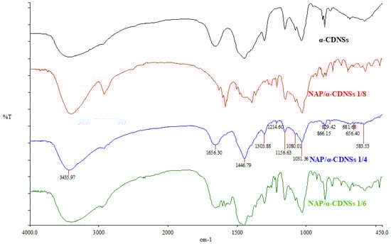 Comparison of FTIR spectra of α-CDNSs and NAP-loaded α-CDNSs at different loading ratios.