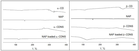 The DSC thermograms of CDs, CDNSs, NAP, and NAP-loaded CDNSs are shown in Figure 7. Both α-CD and β-CD exhibited endothermic peaks at approximately 140 °C and 110 °C, respectively, attributed to the loss of water from the solid state prior to thermal degradation. Additionally, the crystalline α-CD and β-CD showed a characteristic decomposition peak around 330 °C. In contrast, this peak was absent in the thermograms of CDNSs, suggesting an alteration in their thermal stability.