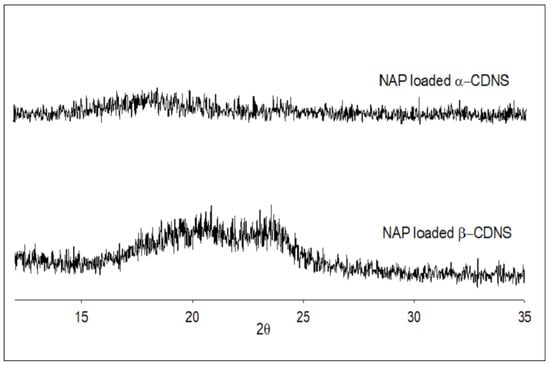 In the DSC thermograms of NAP-loaded α-CDNSs and β-CDNSs, shifted and broadened endothermic peaks were observed at 118 °C and 124 °C, respectively. Therefore, XRD analyses of NAP-loaded CDNSs were performed to further verify the phenomena observed in the DSC analysis (Figure 8).