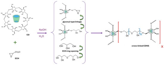 CDNSs are synthesized through cross-linking, a process involving highly reactive cross-linkers with at least two active sites capable of forming covalent bonds with the hydroxyl groups of CDs. This cross-linking occurs via condensation polymerization, requiring the activation of CD hydroxyl groups by the electron-withdrawing groups of the cross-linker. Once activated, these hydroxyl groups are attacked by the nucleophilic sites of the cross-linker, which typically binds to the primary hydroxyl group at the 6-OH position [7]. Various cross-linkers, such as epichlorohydrin (ECH) [16], pyromellitic dianhydride [4,17], hexamethylenediisocyanate [18], carbonyldiimidazole [19], and diphenyl carbonate [13,20], have been employed for the synthesis of CDNSs. Among these, ECH is the most commonly used cross-linker in polysaccharide chemistry because of its high reactivity. ECH contains both an epoxide group and a chloroalkyl moiety, which react with the hydroxyl groups of CDs in an alkaline medium. The polycondensation reaction between ECH and CD produces a heterogeneous mixture of CD glyceryl ethers. Depending on the reaction conditions, particularly the degree of cross-linking, ECH materials can form cross-linked polymers that are either water-soluble or water-insoluble. In a basic medium, the reactive cross-linking agent can form bonds with cyclodextrin molecules (the cross-linking step) and/or with itself (the polymerization step), resulting in multiple interconnected cyclodextrin rings and the formation of a three-dimensional polymer network. Scheme 1 illustrates this reaction, showing the nucleophilic attack of CD hydroxyl groups on the epoxide ring of ECH under basic conditions, leading to the formation of glyceryl-type linkages and a cross-linked CDNS network [21,22,23].